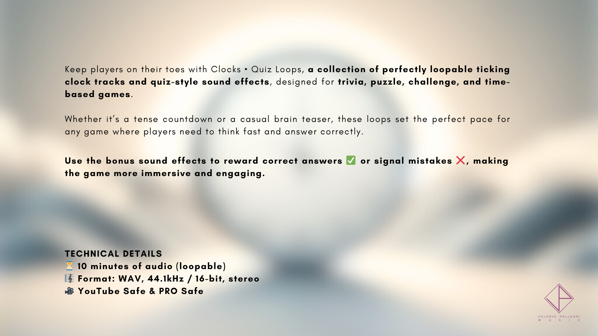 Inside this pack you will find 15 crazy-high quality and perfectly looping underscores with clocks together with 15 audio tags for the final answer. 3 Levels of increasing intensity/tension.
